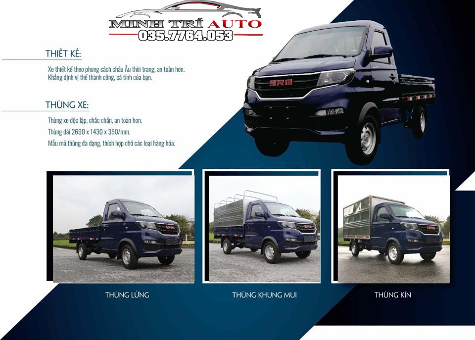 Xe tải nhẹ SRM 930KG có đa dạng các phiên bản thùng như thùng lửng, thùng khung mui, thùng kín, … thích hợp cho hầu hết mọi loại hàng hóa như: Hoa quả, đồ uống, đồ nội thất, vật liệu xây dựng…. Đặc biệt, xe có cả phiên bản thùng bán hàng lưu động, tiện lợi kinh doanh mọi lúc mọi nơi.