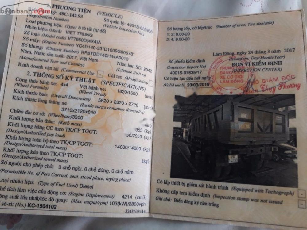 Thông tin Xe tải 5 tấn - dưới 10 tấn 2017 - Cần bán xe tải Ben nhãn hiệu Việt Trung 8 tấn 2017, màu xanh